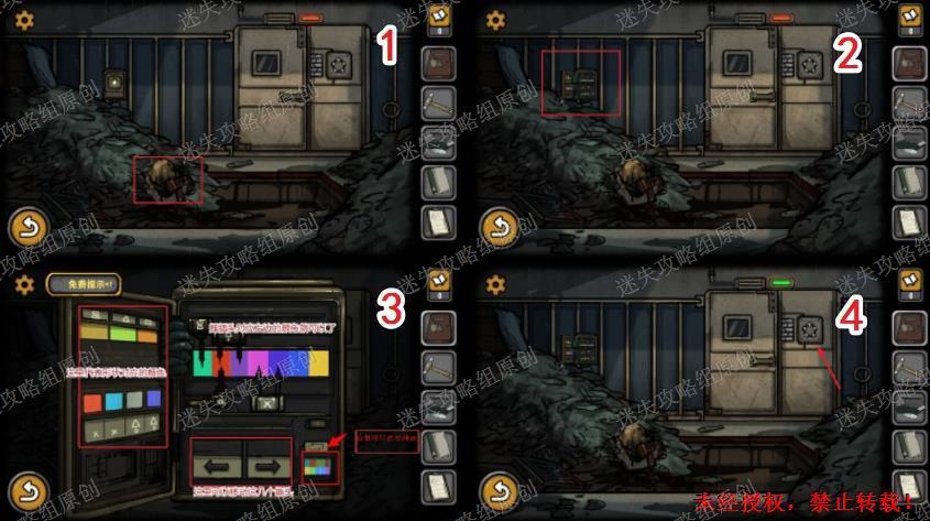 2.将两段绳子结合起来组成打好结的绳子,根据新罐子和保险箱上的颜色顺序提示,能够在罐子上看出颜色组成了数字密码为红色对应7,黄色2,绿色1,蓝色9,密码为7219,打开箱子拿到钩子。