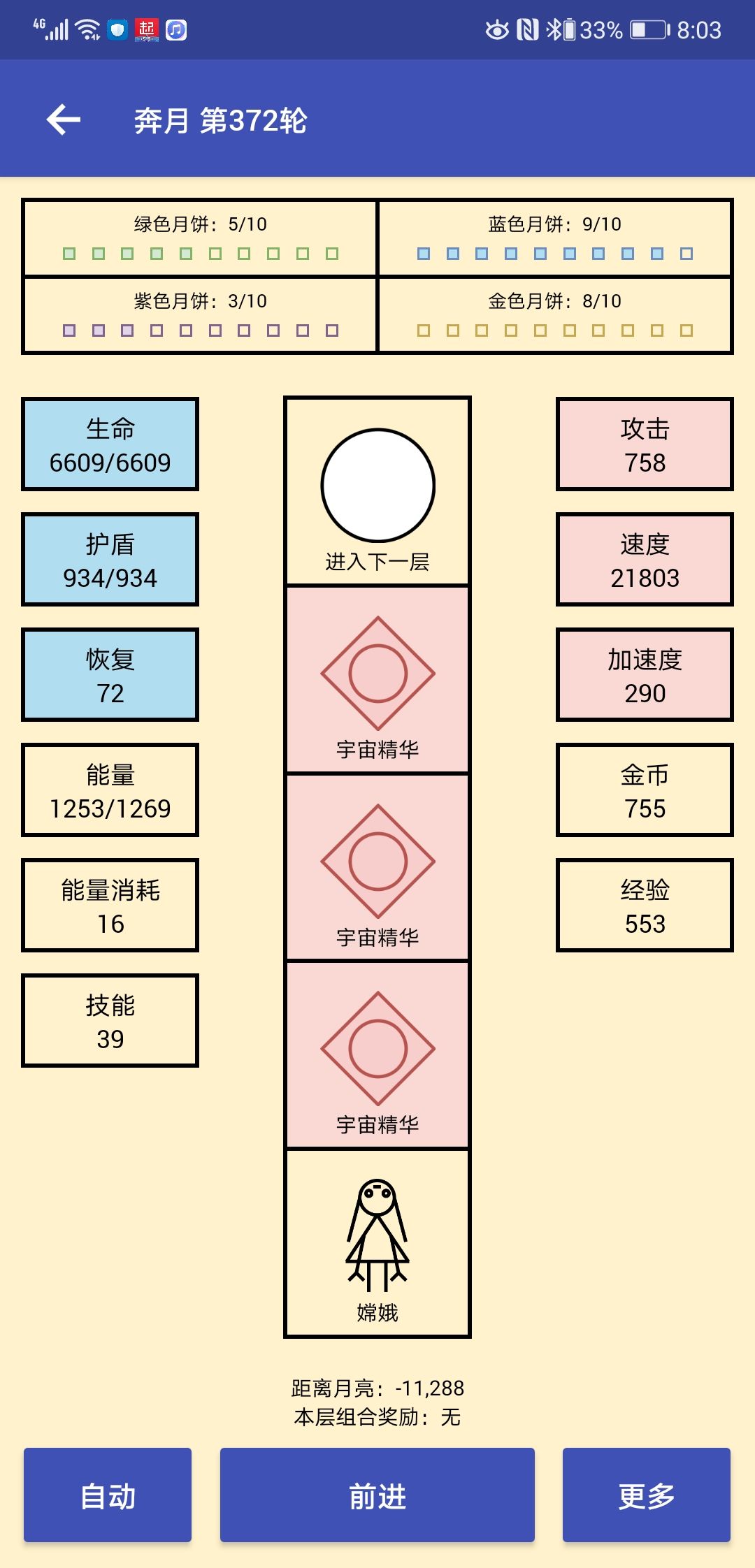 玩法感觉没什么差别,还是先点满闪避,技能优先攻击回血,受击回血,概率无伤,增加生命上限什么的。补给室就缺什么补什么,三个属性都不缺的话就点金币,月饼买来没什么用。改造室点满闪避后会出,所有月饼概率加10%,配合月饼转属性的技能,通关基本没什么问题
