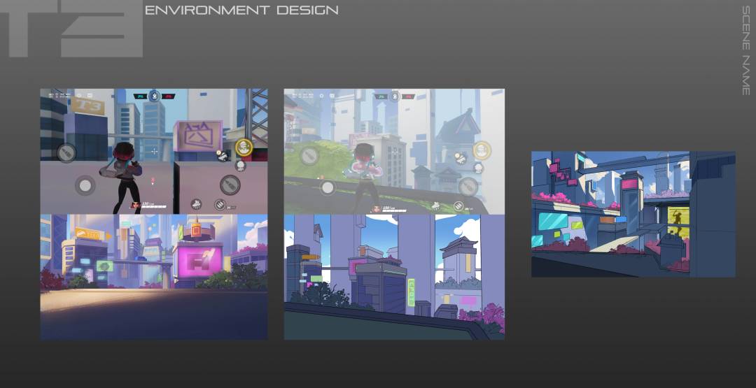 在之前的白模地图美术包装过程中,我们通常会在不影响游戏玩法的情况下“横向包装”,也就是说在非游戏区的空间进行一些主题场景设计,例如说「金币争夺01」中远景楼群的建筑、「十字路口」里中远景的机械载具等等。