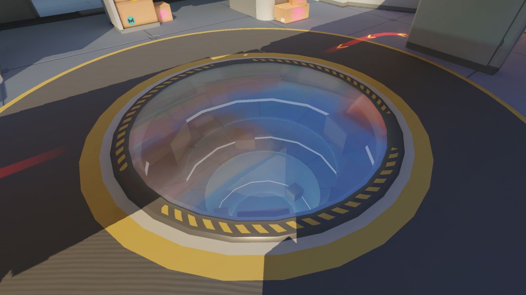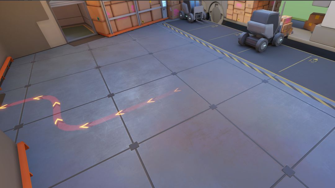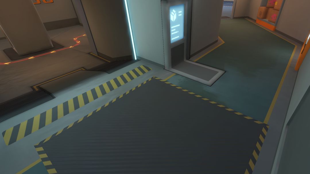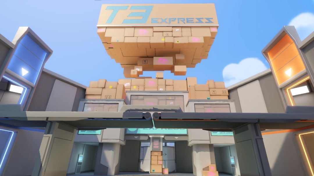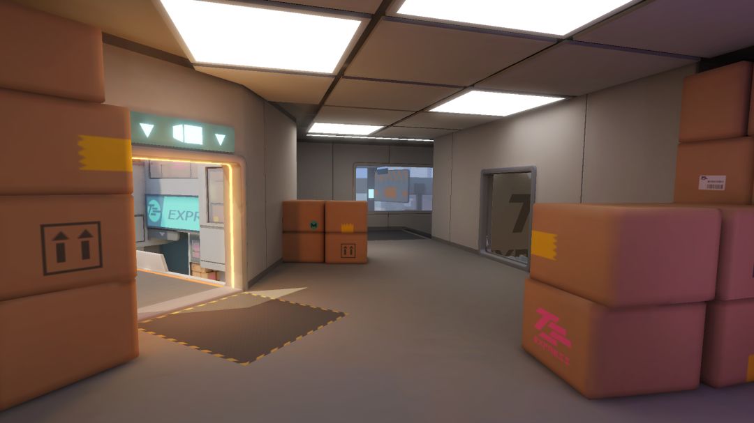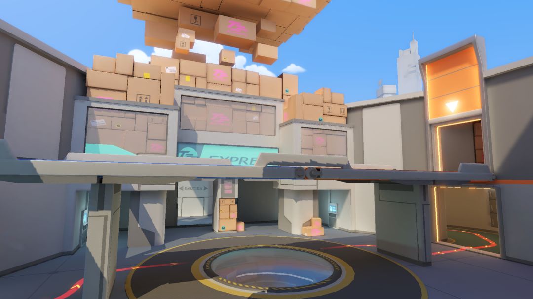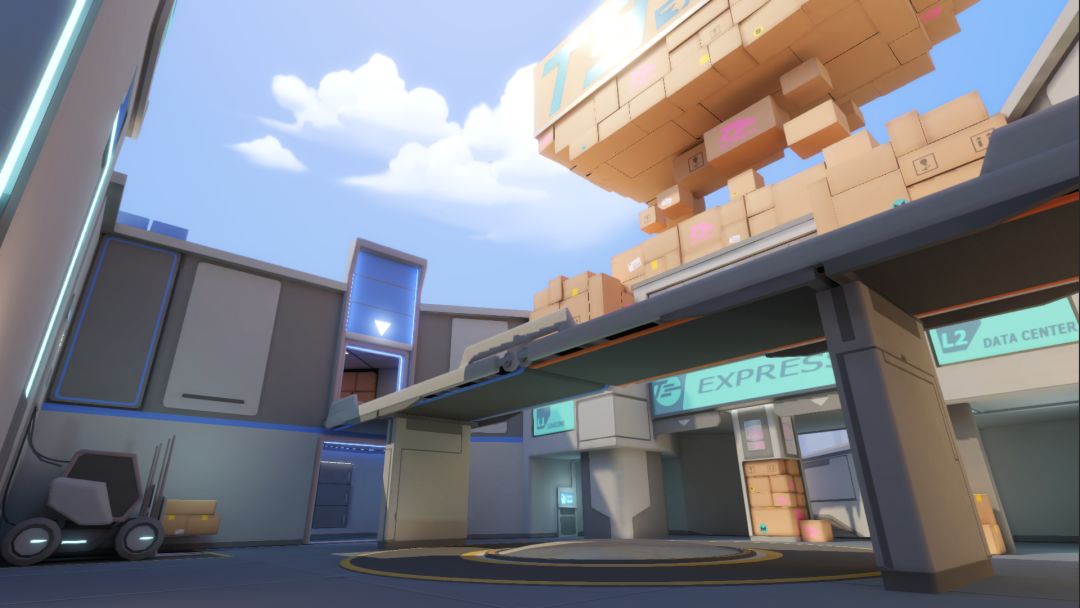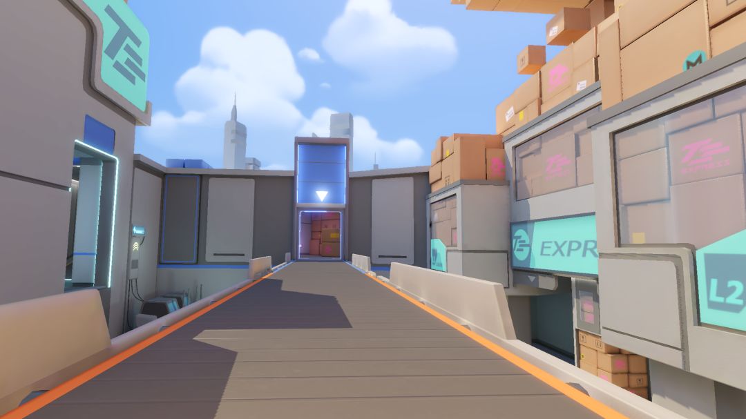 但是在这张地图里,我们在天桥下方的占点区域尝试了“纵向”上的一些设计,将中心区域地面包装成了一个垂直快递分拣仓。