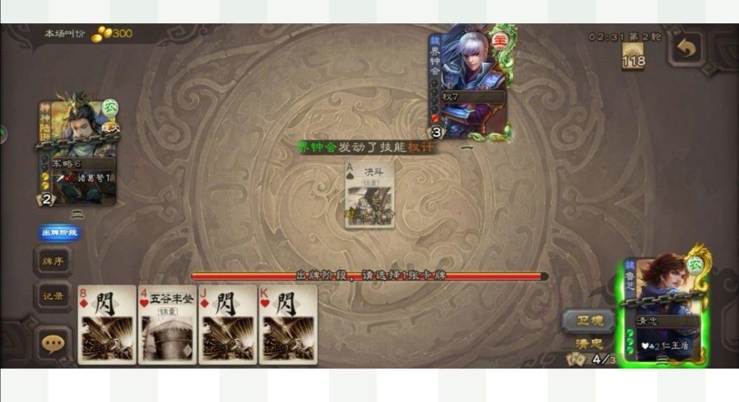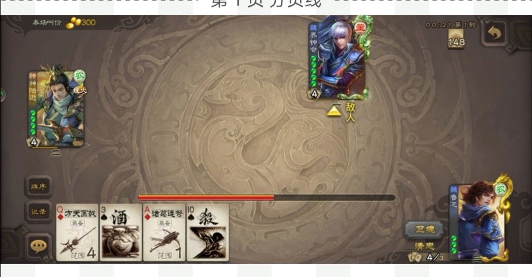 ④开局队友和敌人已经是等牌量手牌最少,在未知敌人手牌的情况下,切忌杀,或者用锦囊(除非能明显察觉到对方是否有无懈的读条)