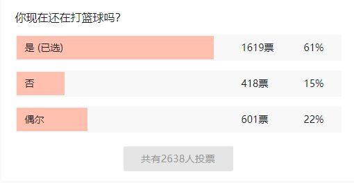 前段时间我们在各大论坛,发起了一场关于校园篮球的探讨,共有2638人参与了我们的投票互动。其中在某论坛的校园板块,61%的用户表示现在还在打篮球,22%的人说偶尔参与,15%的人表示已经很久没接触过过篮球了,那么你呢?