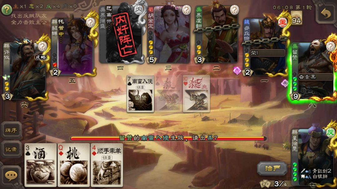 9、军八反贼适合后置位,刷输出牌,既能保证被压血给出更多的牌,又能因主公被队友输出了几波后正虚弱一波带走。