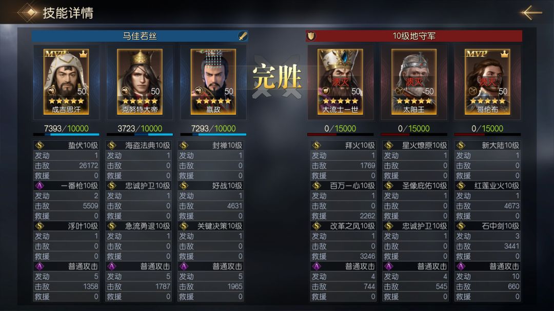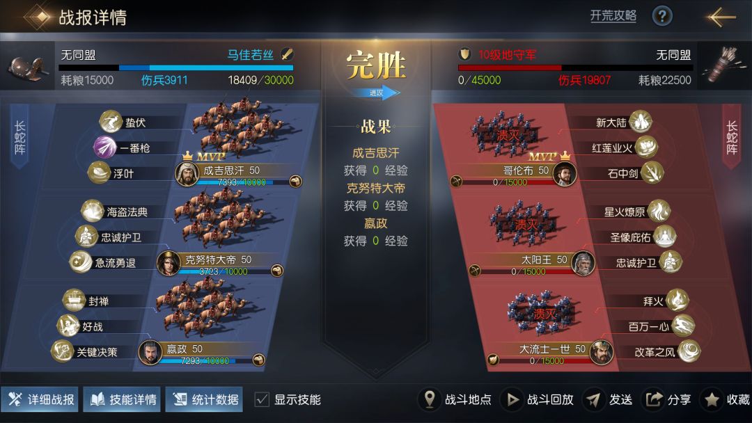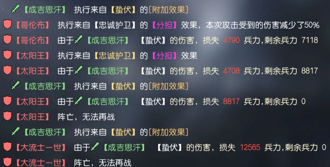 通过战报可以看到,队伍利用克努特的技能,在前期规避了大量拜火与星火燎原的伤害,即使承受了4个回合的伤害,双核的兵力也维持在7000以上,第5回合成吉思汗行动后直接击杀敌方两名将领。