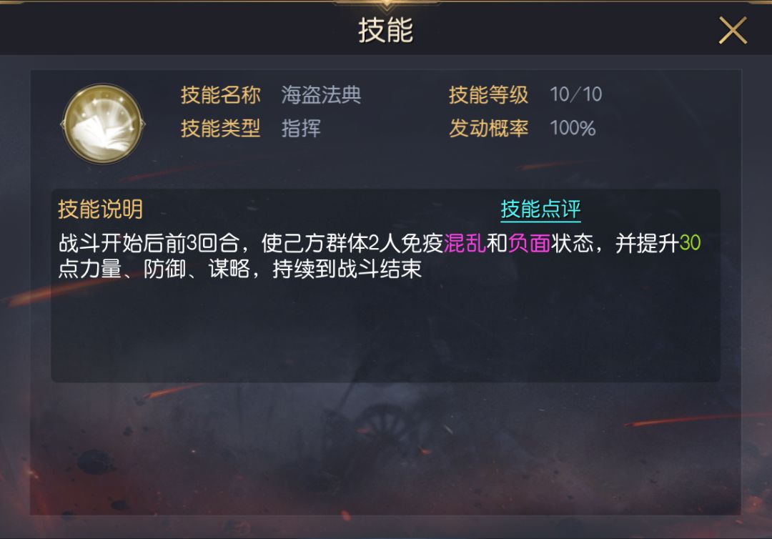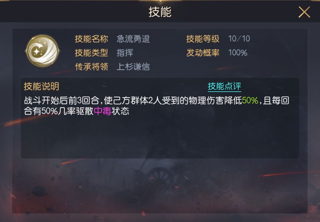 三技能推荐急流勇退,可在前3回合降低己方2人受到的物理伤害,配合其自带技能的负面免疫,能显著降低我方在前3回合损失的兵力。