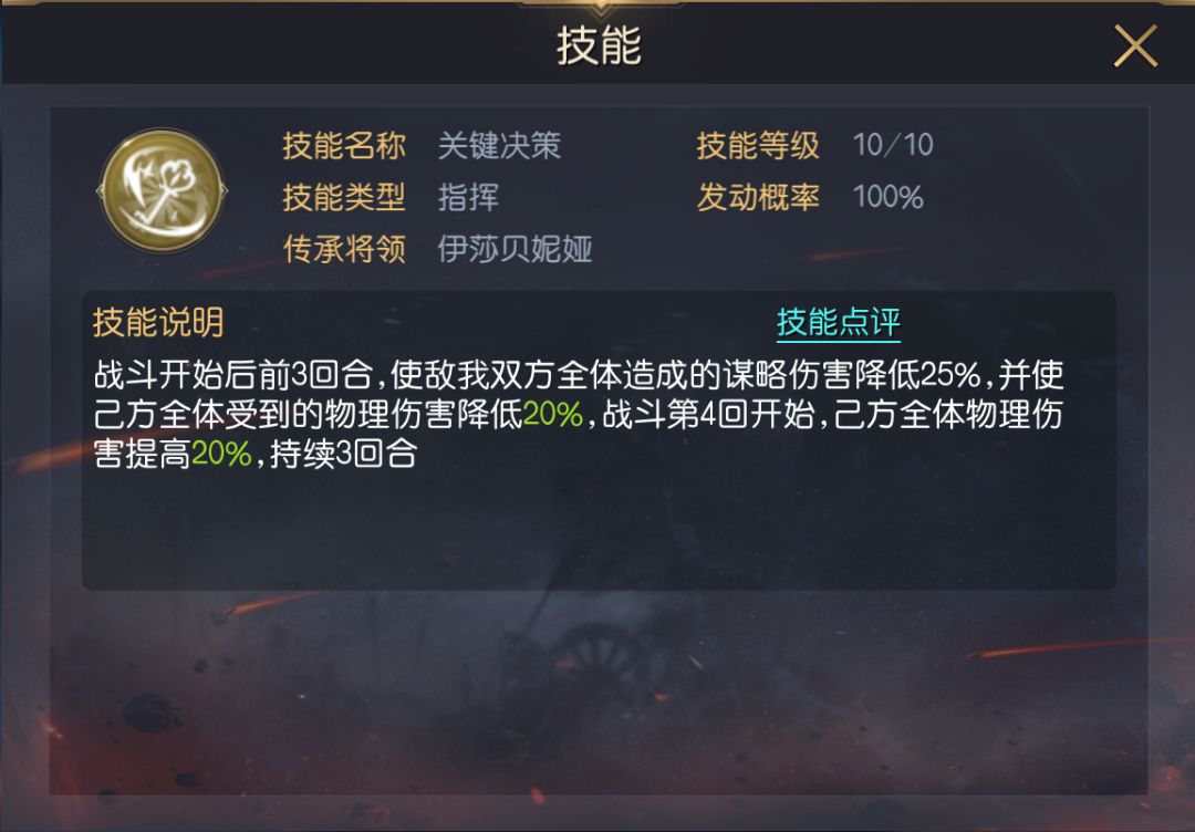 三技能推荐关键决策,能降低前3回合我方受到的伤害,并从4回合起提升我方造成的物理伤害,配合前文提高的多个技能,保证队伍在前3回合拥有极高坦度。