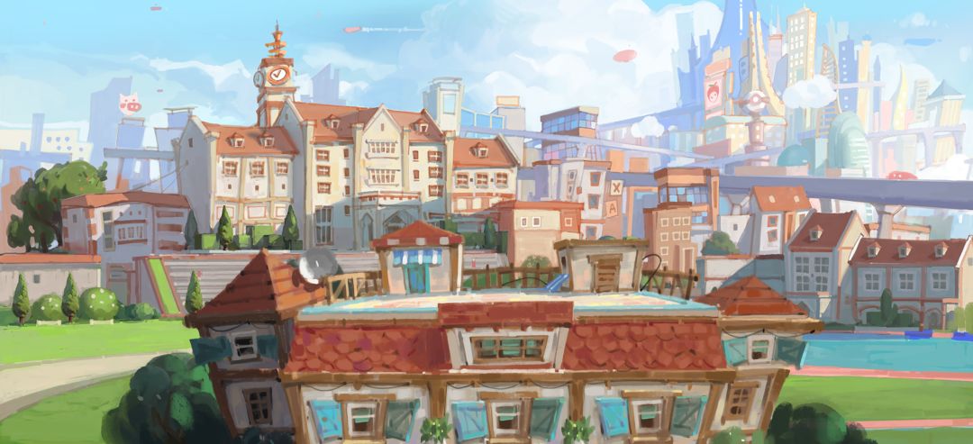 设计师们在沟通思路的时候提到,在勾勒远景都市的时候,想到了白崖(大家可以搜索一下,感受一下),就顺着白崖的形状和思路,把城市部分捋了一遍。近景的战斗场景,我们先出了一版欢乐的游乐场式场景,后面在绘制过程中,我们觉得这样的场景和学院中应有的都市感和青春感偏离太远了,于是重新出了一稿。