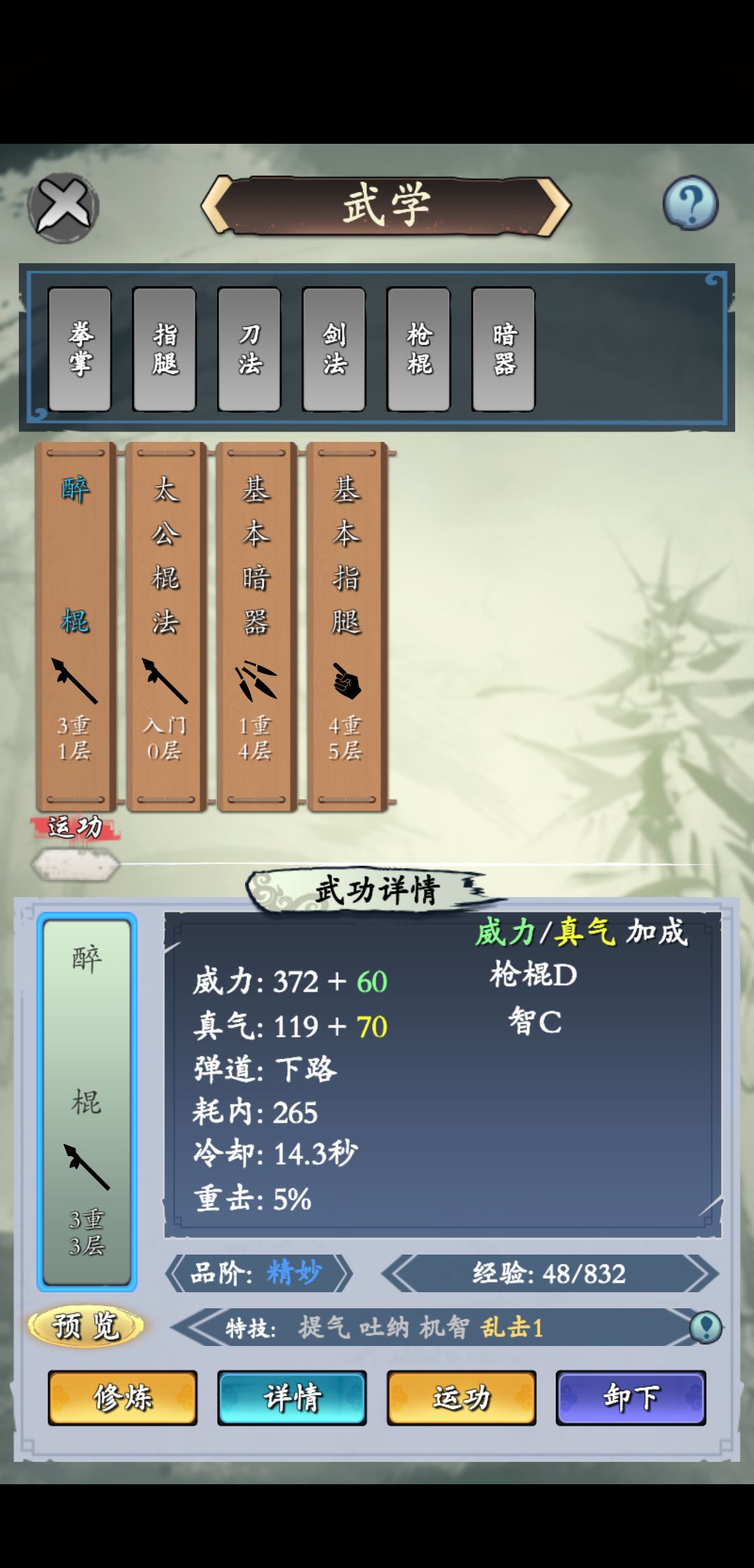 拳本身真气比较高,而且特技有不少带破绽和看破等,,可以考虑用拳破招后给对面上debuff,然后高输出的棍暴力输出(橙品质的棍都不错,值得一提的是蓝品质的醉棍也很好用)…