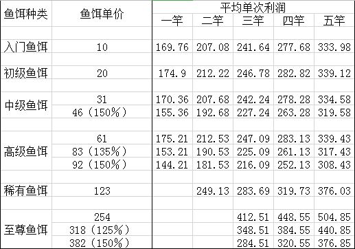 按照一星鱼竿免体10%,二星15%,三星20%,四星25%,五星30%的概率计算,单体利润为: