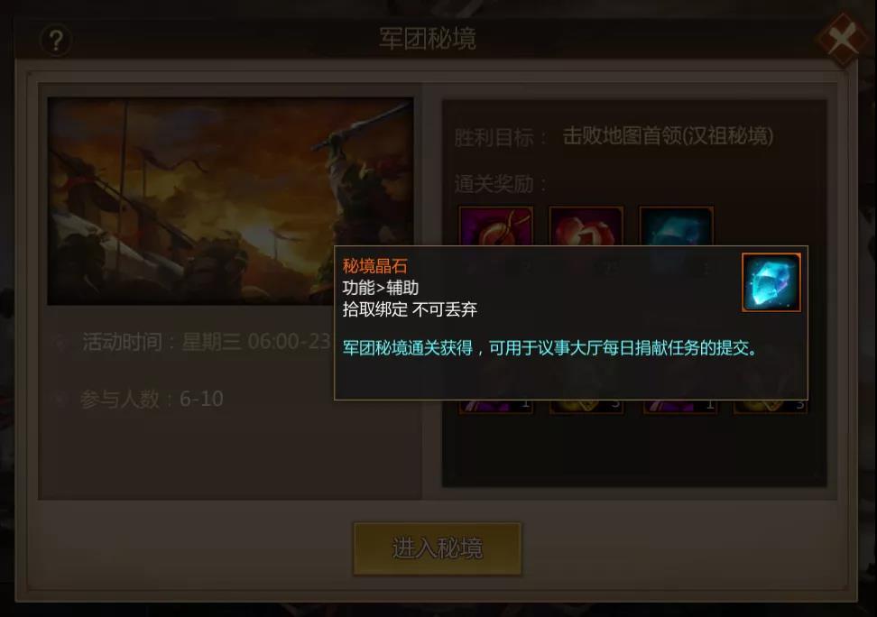 不过要注意,秘境晶石只能通过参与军团秘境达成通关后进行获取。
