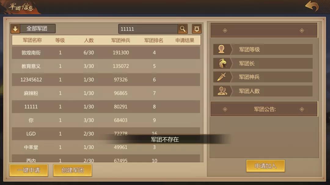 首先当大家根据军团ID搜索军团时,当该军团不存在时,会在界面中提示“军团不存在”并停留在当前军团列表处,而不会再转入一个空的军团列表。