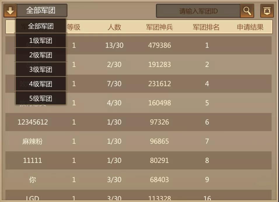 其次,增加了【军团等级筛选】,通过点击左上角箭头,可以根据军团的等级来查看出当前所选等级的军团列表,以方便查找对应等级的军团。