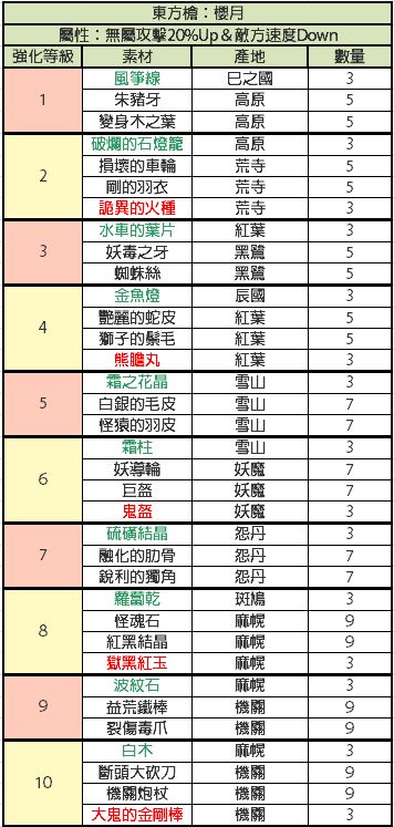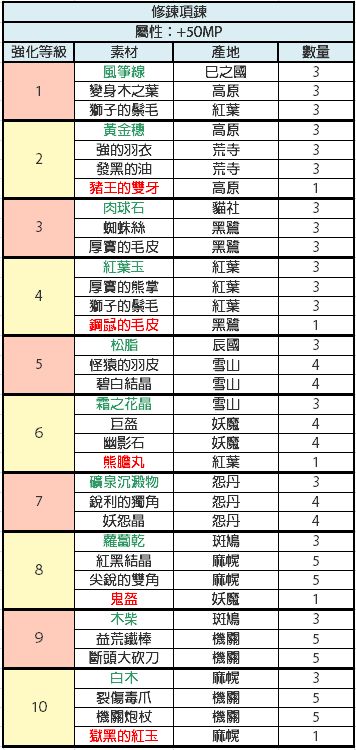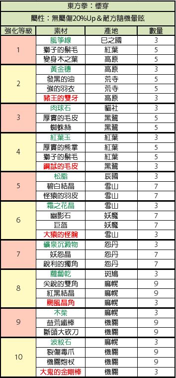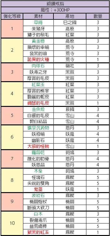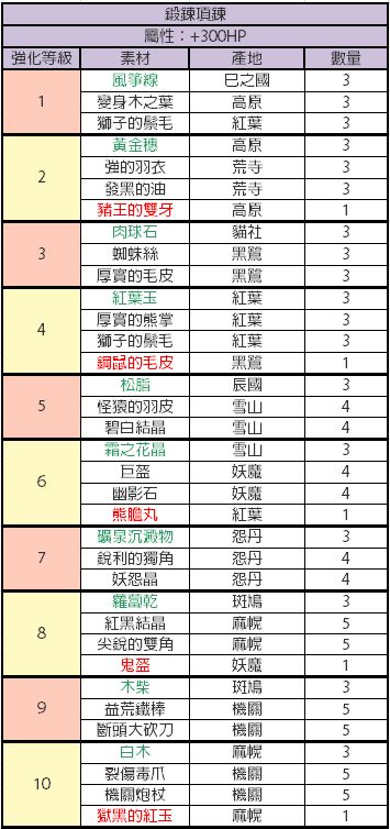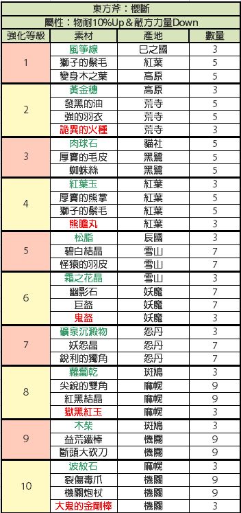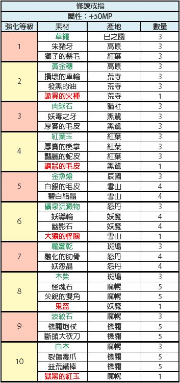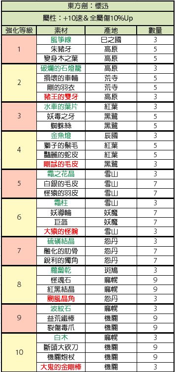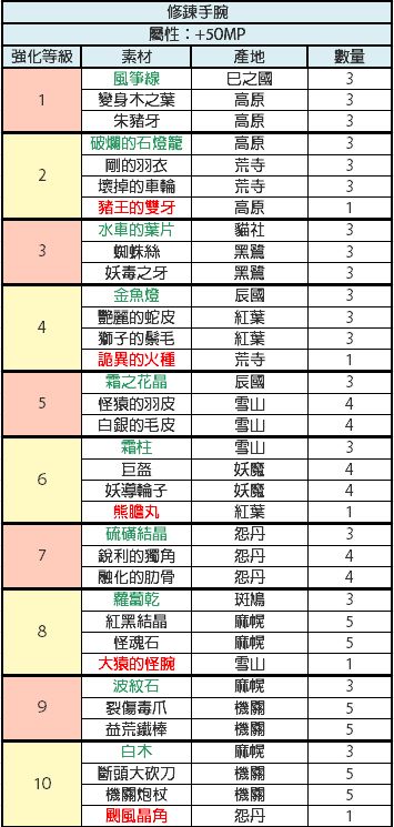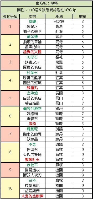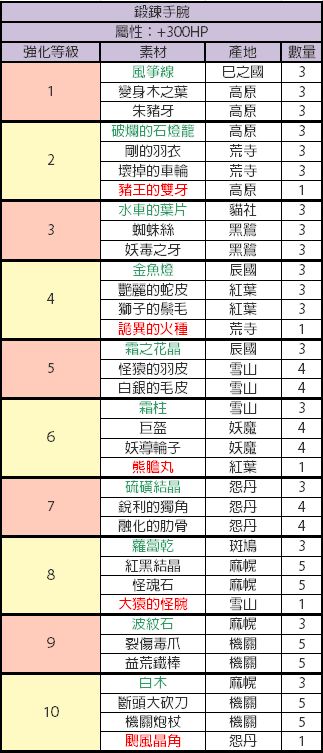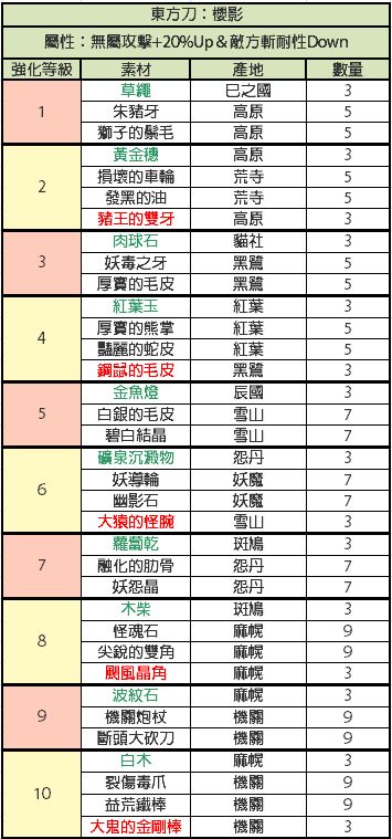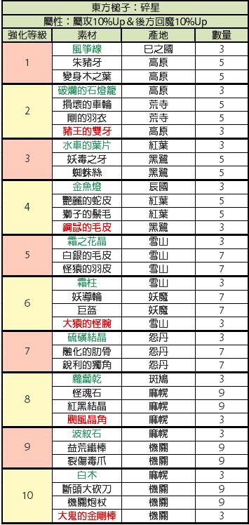 比较懒,才开始做现东装备,发现没有人发装备升级材料,就又去巴哈搬运了,还是这种有详细列表的看着舒服,包含装备推荐,材料名称已经对照过是一样的,绿色代表闪光材料,红色代表fear材料,其他的是小怪材料
