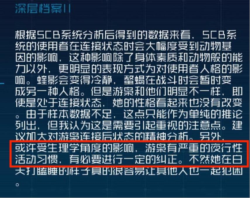随着新资料片而来的还有新剧情,新剧情是围绕着“黑暗狩猎者”展开的,目前最后故事还没有完全落下帷幕,等到一切都结束后,看情况可能会出一期解析,把这些剧情串一遍,和其他的主线结合起来。新资料片里的主角“黑暗狩猎者”里的游枭、蝰影和螯蝎都是在西奥多博士的改造下完成的,而使她们如此出现的正是SCB系统。
