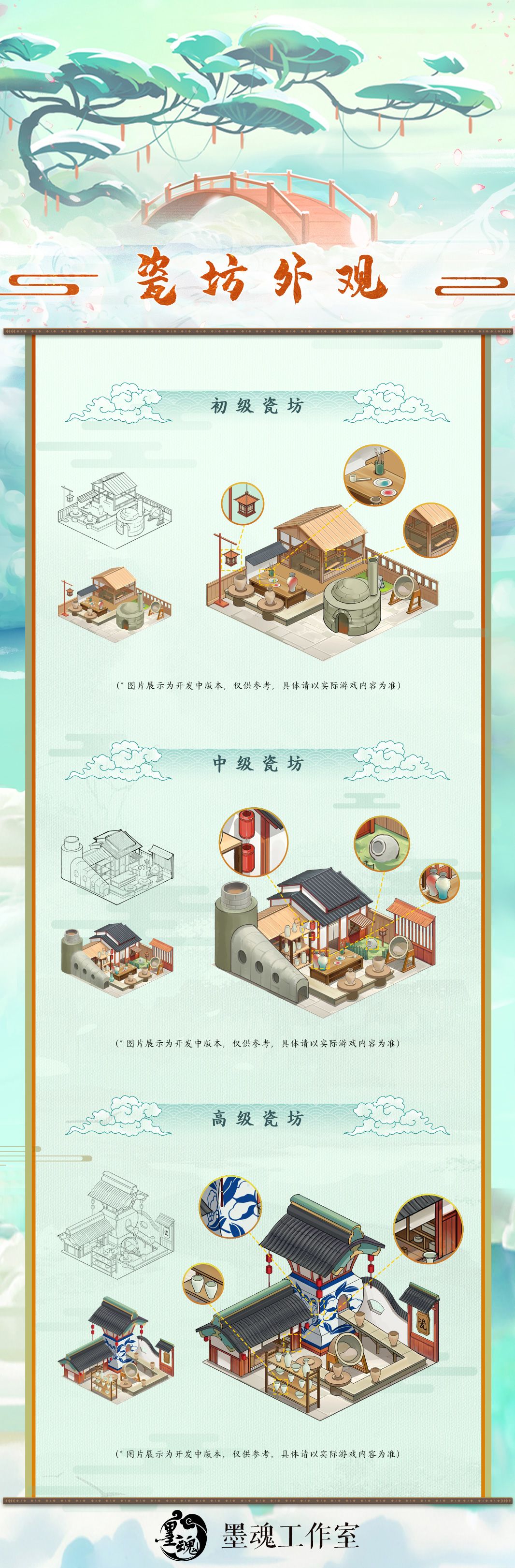 工坊是墨痕斋生产货物的主要来源。在兰台和墨魂的共同努力下,墨痕斋中的工坊建筑逐步扩建。可生产的货物逐渐增加,生产工具科技更加先进,工坊建筑的设计也突破原有形制进行创新,更加精致美观。