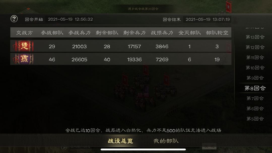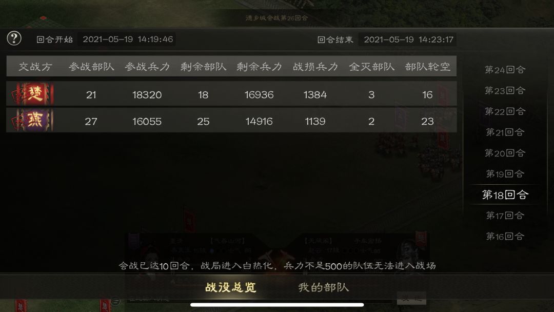 直到第18回合,楚国援军以压倒性的数量进入了战场后 ,开启为期11回合的大战。看到楚国援军的数量,香香以为这场争夺战就要结束了,一转眼又在入口看到了燕国援军,香香心想:“难道还有转机!?”结果其实只是零散的援军啦(¬_¬)瞄。香香想说,国战当前,这位单枪匹马进入战场的主公真是勇气可嘉,但是一个人的力量真的太渺小啦,还是组团进入战场最保险嘛!