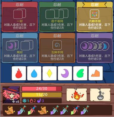 通过快艇骰子的玩法改造和卡牌融合,已经确立了核心战斗玩法。但此时的出战牌组并不是固定6张,而是类似杀戮尖塔,从牌包中随机抽取6张手牌,然后掷骰子,打出手牌。