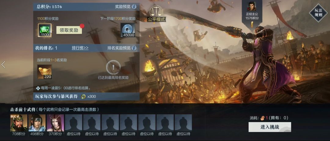 之前提到,每个小霸王可以任选自己已经拥有的武将进入玩法,系统每周会记录击溃数排在前十的武将。若小霸王在一周内多次使用同一个武将进入玩法,那系统将会记录该武将击溃数最高的一次成绩。说到这里,霸哥突然觉得,这似乎不仅是霸者之间的比拼,还像是一场不断自我突破的过程,很有意义啊!
