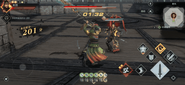 虽然时间很短,但是在精于割草的大佬们面前都是小菜一碟。而且只要你技术够好,在完成任务指定的击溃数后,小兵们就会消失,取而代之的是场景中央气势汹汹的吕布。此时倒计时依然在走,你需要凭借炉火纯青的打斗技术迅速击败吕布,那将为你赢得30秒的额外时间!