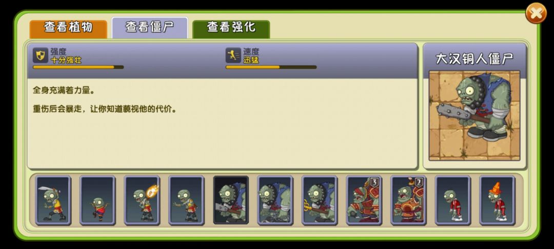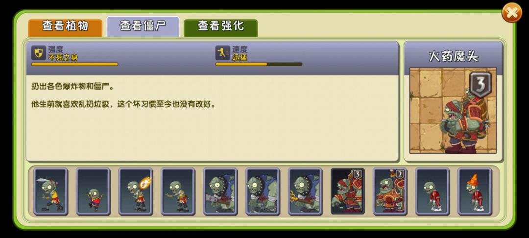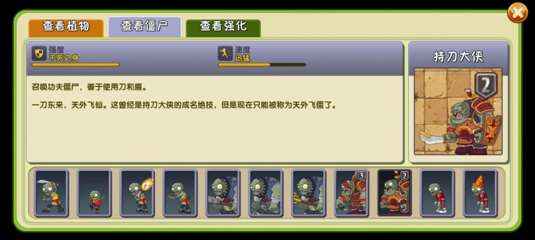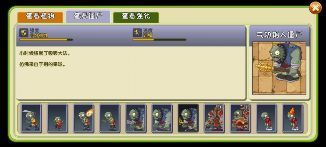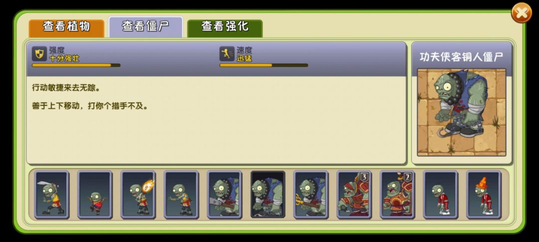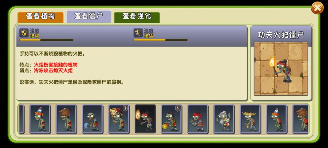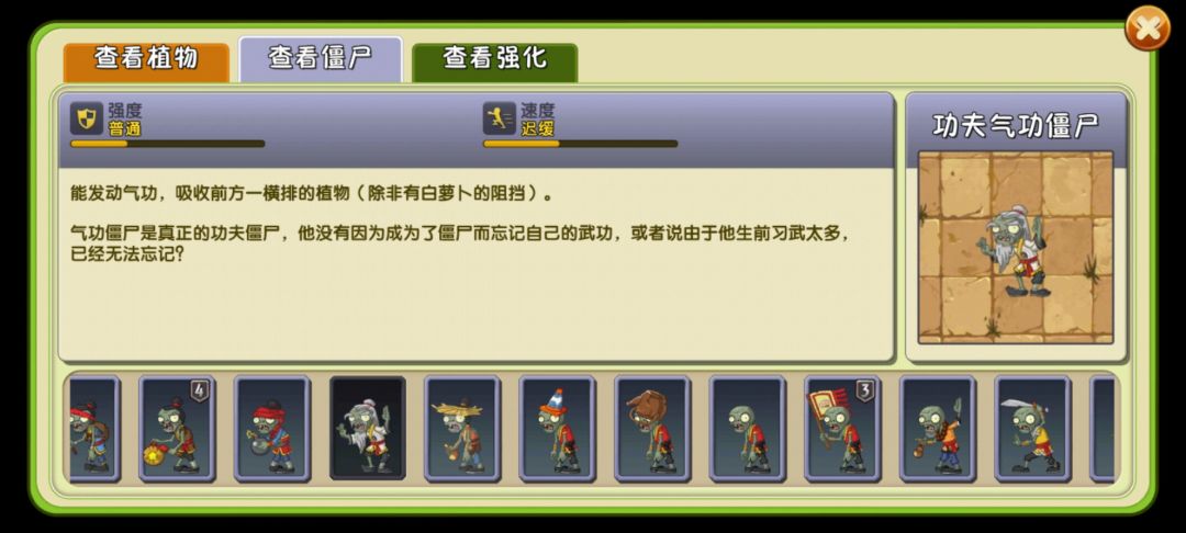 在新手初期,这个还是比较可怕的存在,如果让功夫世界的关卡更加丰富,也许也是一个拓维探索方向…(特点:爆发力极强,有点像埃及木乃伊僵尸、周刊僵尸和报纸僵尸等。)