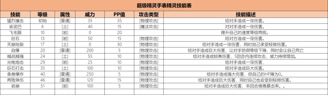 精灵解析:普通野生精灵,整体种族值偏低物攻物防优秀,不过拥有两大自爆神技配上高物攻,pve可以一用。