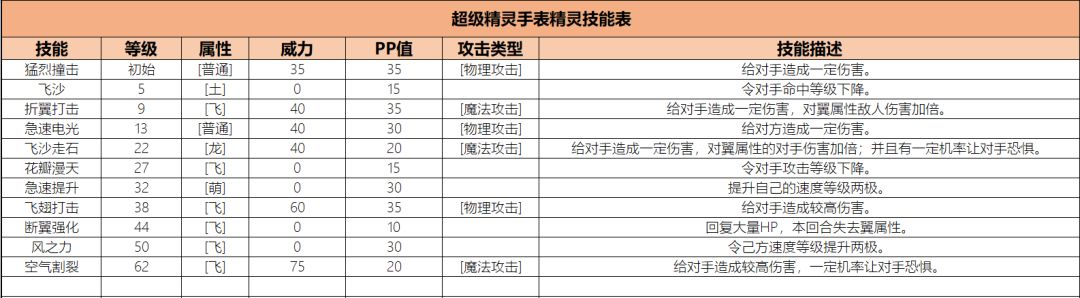 精灵解析:普通野生精灵,整体种族值偏低速度还可以。没有大威力技能,只有个看得过去的提速技能,或许双打有用。不推荐。