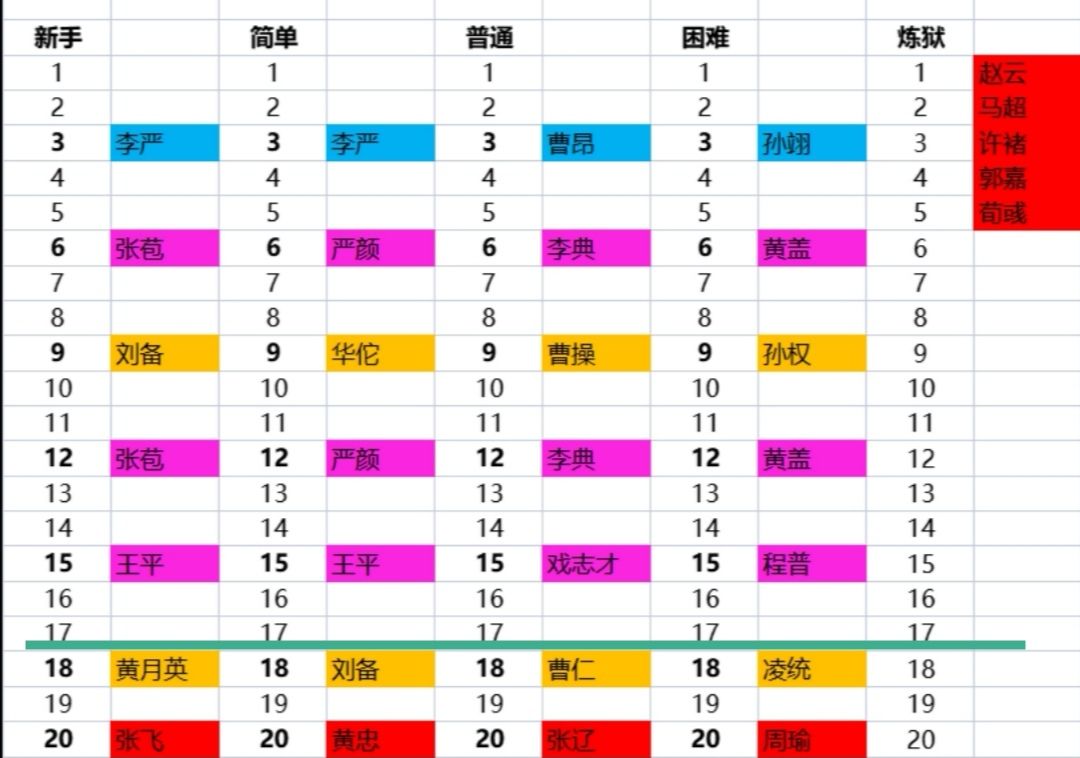 详细说说新手,简单,普通,困难这四个阶段,每个阶段1—10关是低等难度,没有任何豪杰关,有手都能过(包括困难),11—17是中等难度,有手有脚都能过(打了就知道),关键是18,19,20,这三关是需要运气的,不要怕死,因为每次进入豪杰关都是随机将领,总有运气好遇上二百五的时候,特别是每个难度最后一关,非常看脸。