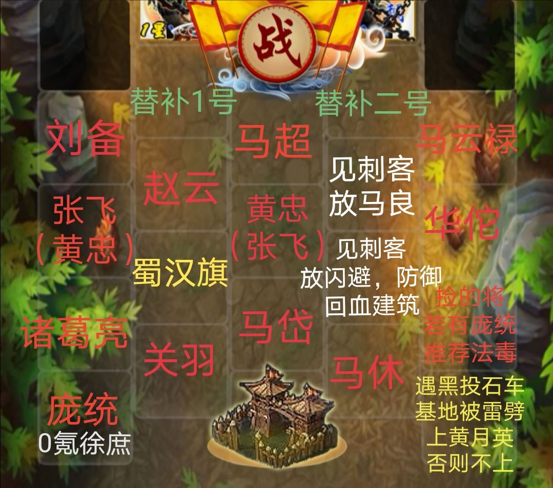 因为前期升级较快,我的阵型图是14级成型的,等级低点可少带徐庶,马休,建筑可只带蜀汉旗(蜀汉旗四级前可不带任何建筑),15级开始可多带个拒马。