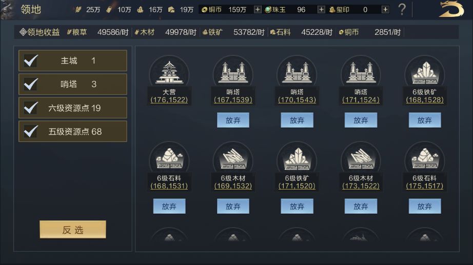领地是用来统计目前为止主公所占领的资源的数量,位置以及资源等级的板块,大家可以直接通过领地界面放弃低等级资源,跳转到某个指定哨塔,要塞等等。
