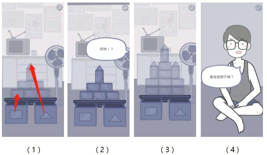 此时需要垒成的积木就变成(图3)的样子,此时需要拖动积木同时让手机向左侧倾斜,这样爸爸也会帮你砌积木了,你垒成一块的时候会出现爸爸的对话同时也会垒成一块(图4)