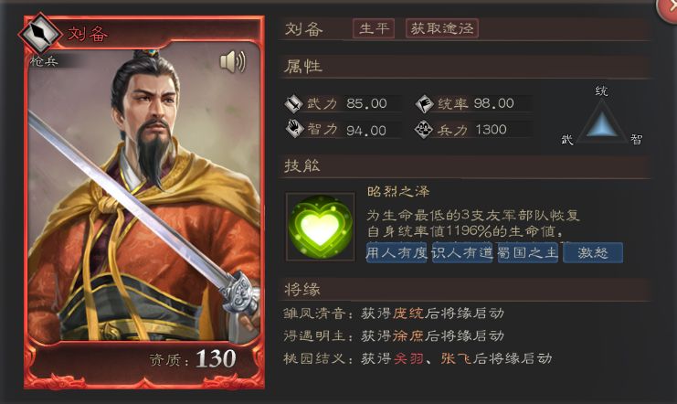 刘备的主战法为“昭烈之泽”这名字正照应了其辉煌的荣耀——汉昭烈帝,其技能可以为生命最低的3支友军部队恢复自身统帅率值1196%的生命值!相比于大乔的980%恢复率和华佗的605%的恢复率,刘备的补血能力更胜一筹。若目标生命值已经满了,则生成同等数值的护盾持续7秒,同时清除并免疫控制,持续7秒。如此能防还能奶的武将,真是让人心动!升级到1星后可以解锁用人有度技能,在战斗中,受到致死伤害时不会死亡,会立即恢复30%的最大生命值血量,但是每场战斗只生效一次哦!升级到3星后即可解锁识人有道技能,在战斗开场即可获得7%的免伤效果,生命值低于50%时效果翻倍。5星时解锁蜀国之主,所有友军部队抗性增加8%,枪兵部队和骑兵部队效果翻倍。7星技能激怒,在战斗开始时会自动获得240点怒气,可以快速施放技能!整体而言,刘备作为高资质红色武将,各方面表现都十分优秀,能自身防御的同时还可以为友军回血,恢复生命值,即使在未达到高星级别也可以为所在队伍创下不少收益呢。