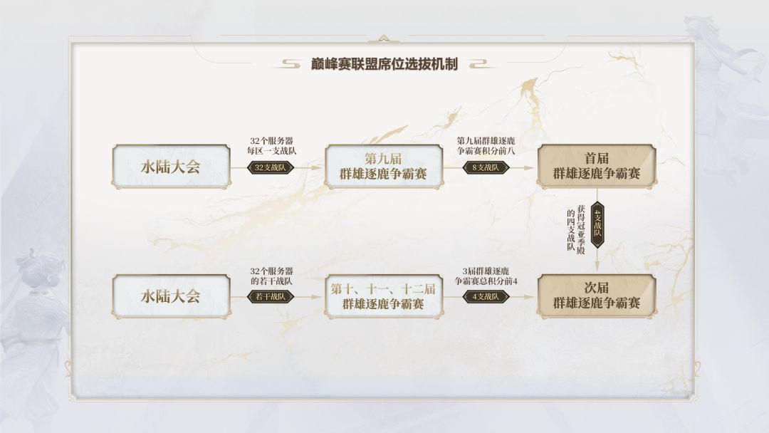 群雄逐鹿巅峰赛采用全新职业电竞赛制,以职业制作水准为广大参赛选手与观众提供最佳的赛事平台。巅峰赛每年将举办两届,每届比赛又分线上常规赛与线下总决赛两个部分。首届巅峰赛将于今年6月10日至7月4日率先进行为期4周的线上常规赛,每周紧凑进行多达14场双循环积分赛,足以令观众大饱眼福,酣畅淋漓地围观巅峰高手的决战!线上常规赛积分前4的队伍将获得进入线下总决赛的资格,并通过7月16日至7月18日三天残酷的BO5单败淘汰赛,角逐出最终的冠军队伍!冠军队伍将代表着全服最强的战力,拥有全服最高的荣誉和奖励!