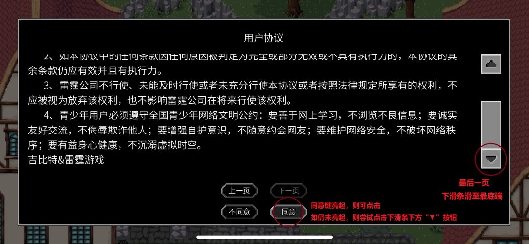 3、理论上1、2、两步结束之后,同意键亮起,就可以点击;如果还是不能点同意,尝试点击右侧滑动条的下键