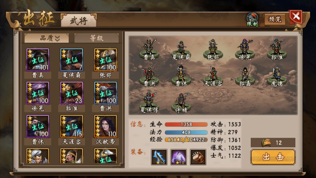 曹休100级三星:输出装备(李广弓,手套),buff技能点满。(加buff,利用李广攻,制造输出环境,貌似比曹洪厉害很多)