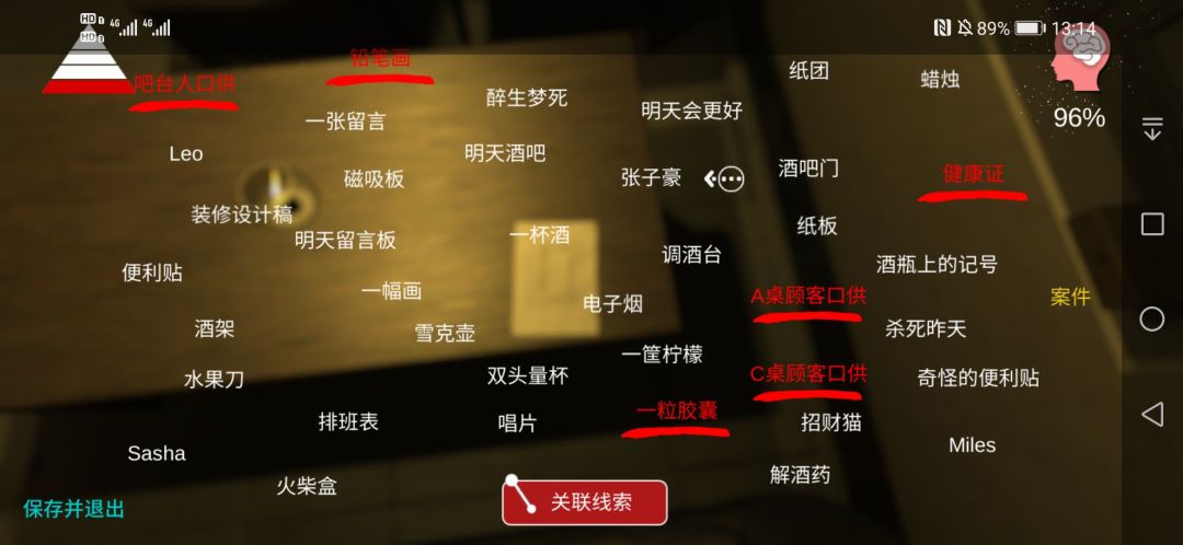 总算96了!就差2个了。应该差的是手法,过程+真相。可就那一点实在想不明白。试了多次都不对。酒客的口供说死者喝多了,应该选上?工作人员说徐青特意给死者调了酒,应该还有那维生素?胶囊?还有什么?