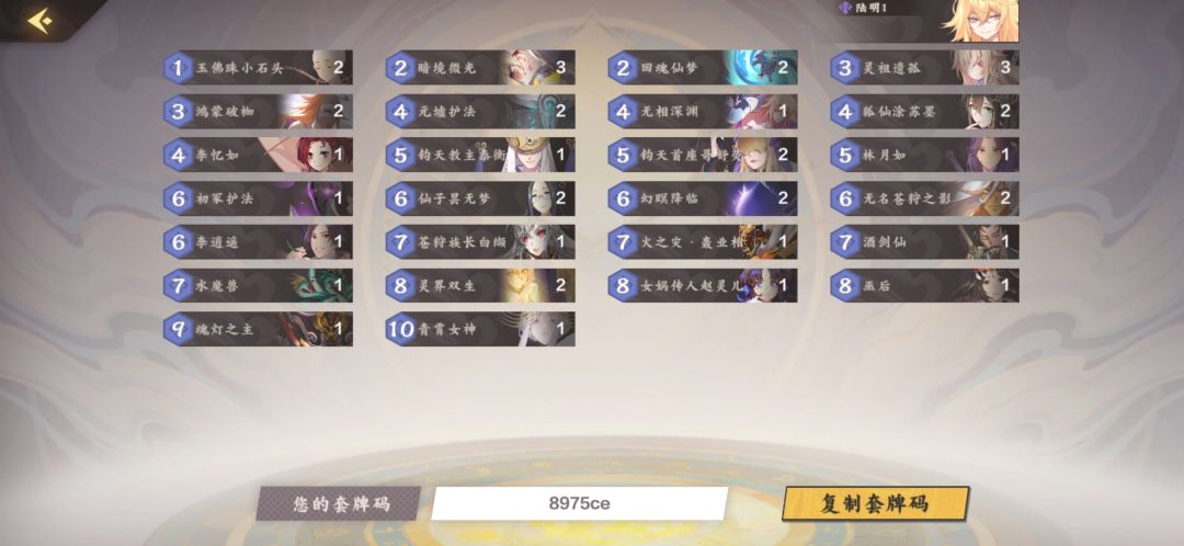 我是直接抄的排行榜上的,个别卡有点出入是根据自己段位稍微调整了一下,反正我至尊3000+是乱杀。思路也很简单,起手留跳费,如果打的是快攻可以留一个回手缓解一下前期压力,一定不要舍不得用,这套牌基本就是10个回合左右就定胜负了,打有大清场的职业(尤其是阴)或者是靠站场的职业(比如木和土)可以留一个全体回手来秀对面,最后是用好两个巨型生物可以让你的对手血压飙升
