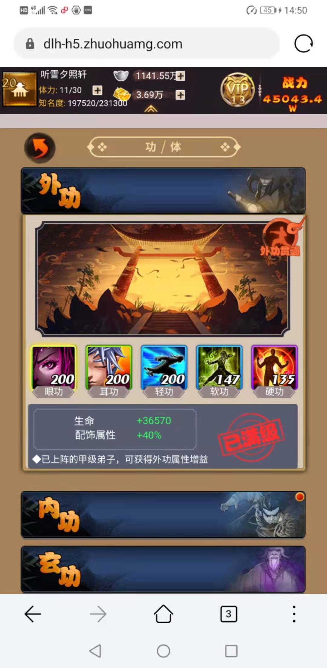 而另一部分则是不论我们是否选择氪金,都需要通过消耗时间来慢慢积累的,就好似修炼内功。好比每次活动开启的闭关出关道具获取,连充才能拿到的阵法,以及最最核心的两点:人物等级和人物功体。注重这两点的积累,会让你的培养从量变到质变,内功等级也如同从全真心法练成了九阳神功。