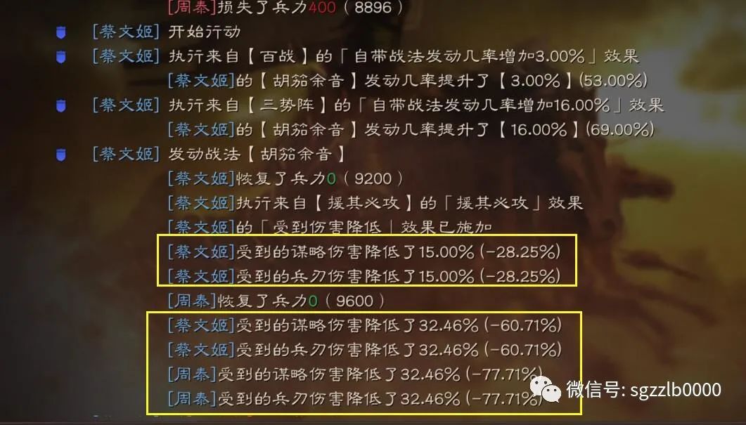 由于蔡文姬可以释放免伤效果,队伍中有2个武将持续处于高免伤状态,所以队伍就是个抗打的乌龟,敌人咬不动。