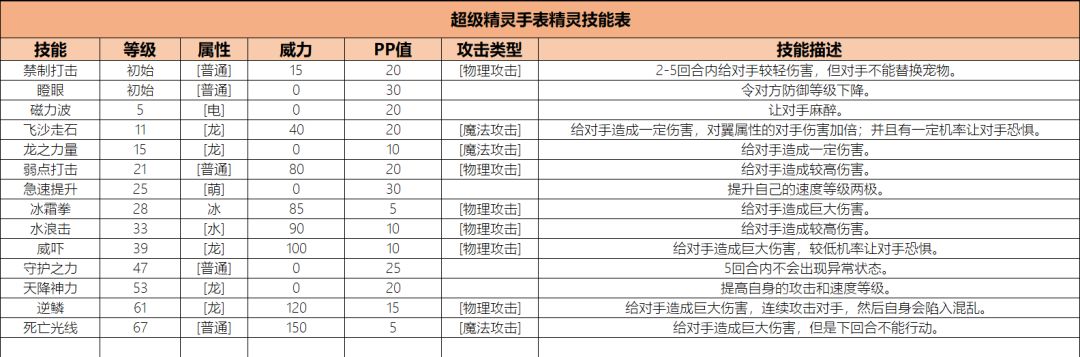 精灵解析:地图稀有精灵,整体种族值可以物防生命偏高。技能还可以,有大招守护之力以及强化技能。目前大部分龙系都是这种类型,不过崩坏龙应该会有超进化,练了不亏。