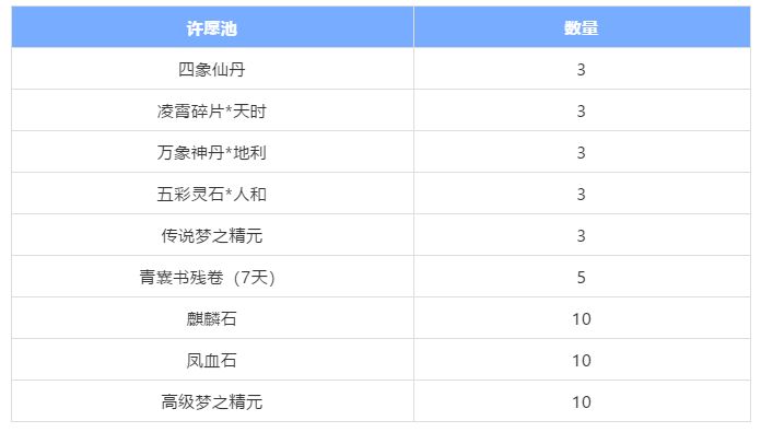 奖池的奖励数量有限,当某样道具剩余数量为0时,则不会再随机到该奖励。因此,大家都能够获取许愿池中的全部奖励,其中包含了四象仙丹、天地人碎片、青囊书残卷等奖励。
