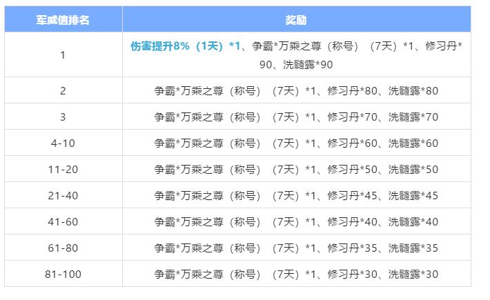 每一期排名前100的军团均能够获得一个限时称号—争霸*万乘之尊,以及数量不等的修习丹和洗髓露。