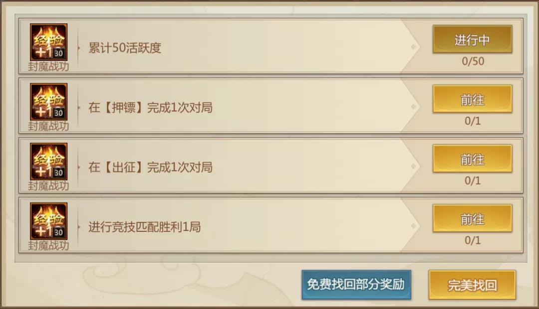 在活动期间,大家可以通过完成每日专属任务来获取封魔战功,提升封魔等级。同样的,如果没有完成或者漏掉了某一天的任务,也可以通过找回来获取未完成的奖励。