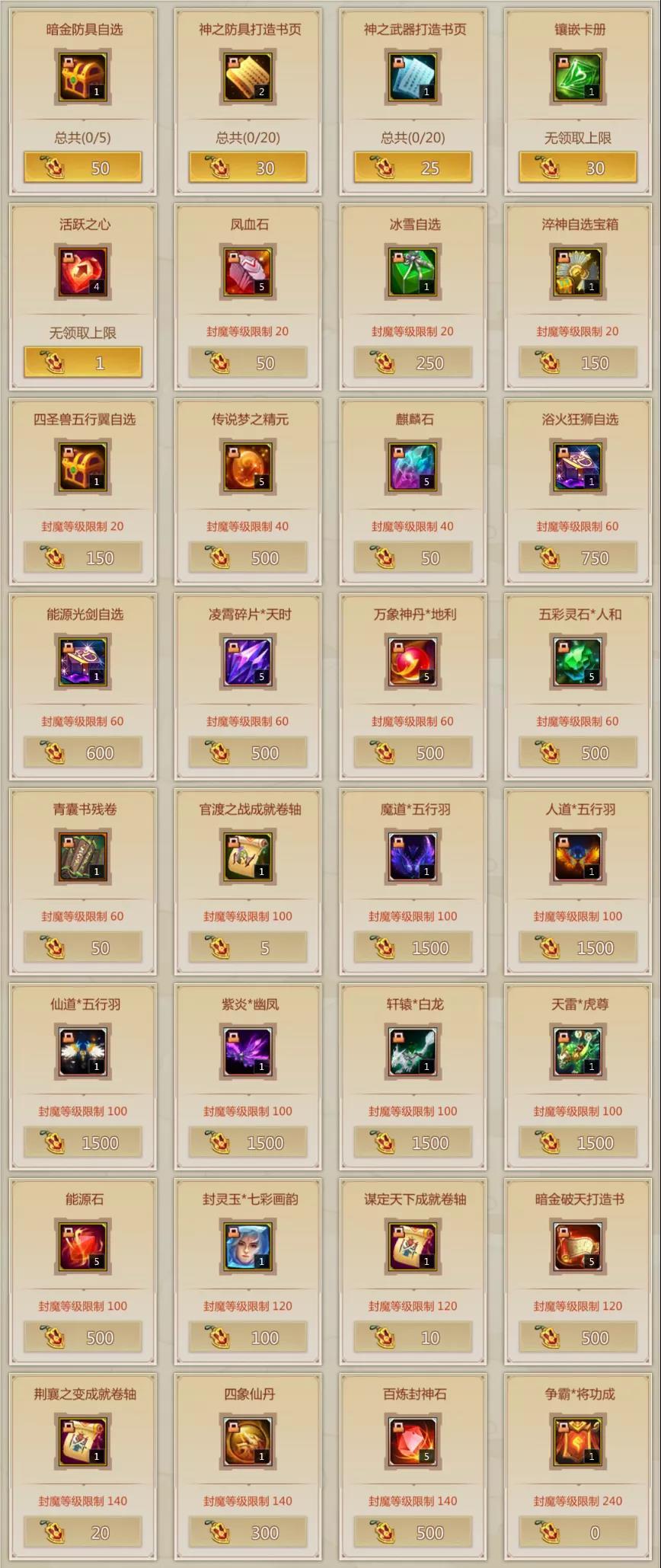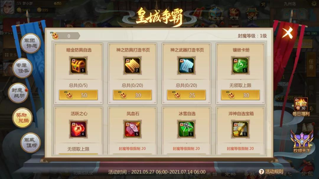 大家获得皇城争霸勋章后,就可以在奖励兑换界面中兑换各种奖励了。要注意的是,不同的奖励兑换是有不同的封魔等级限制的。