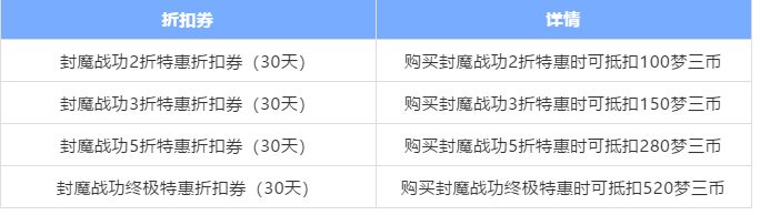 另外,在这个礼包中,梦梦也为大家准备了几张封魔战功特惠折扣券,大家在购买封魔战功特惠包时,能带来不同的折扣,这些都能帮助大家快速提升封魔等级。