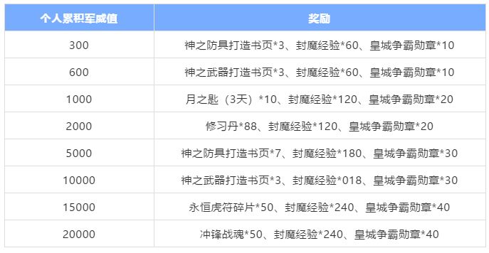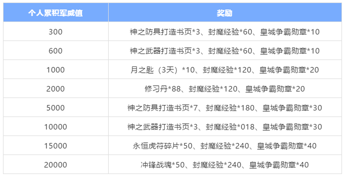 个人奖励中,除了能够获得包括冲锋战魂、永恒虎符碎片在内的多种奖励外,还能获得大量的封魔战功和皇城争霸勋章,每使用1个封魔战功能够获得10点封魔经验,皇城争霸勋章则可以用来兑换大量丰富的奖励。