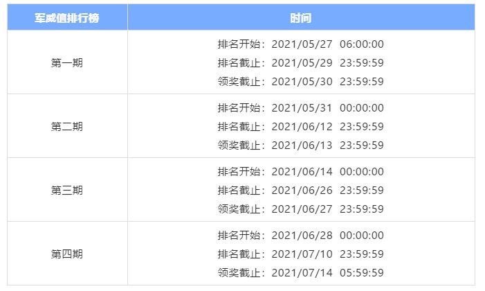 整个活动期间,以每两周为一个周期,军威值榜单会在每一期截止后重置并重新开始排名,而榜单上的军团成员可以在每一期奖励领取截止时间前领取对应的奖励。