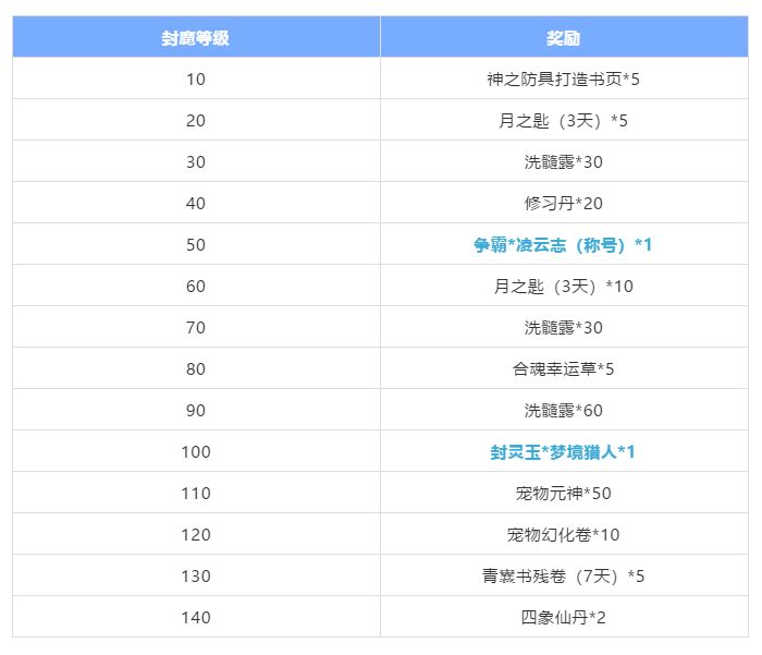 在这次封魔中,大家通过提升封魔等级,除了能够获得包括洗髓露、合魂幸运草、宠物元神、宠物幻化卷等在内的多重奖励外,在封魔等级达到50级时,还能够获得一个专属称号—争霸*凌云志。