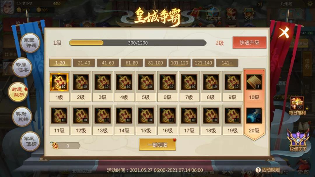 获取封魔战功,提升封魔等级,则是大家在封魔活动要做的另一个重要的任务了,封魔等级每提升1级,都会获得皇城争霸勋章,同时每10级,会获得其他的稀有奖励。