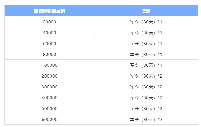 军团奖励中,当军团累积军威值达到一定数量后,军团成员便能够领取对应数量的军令。