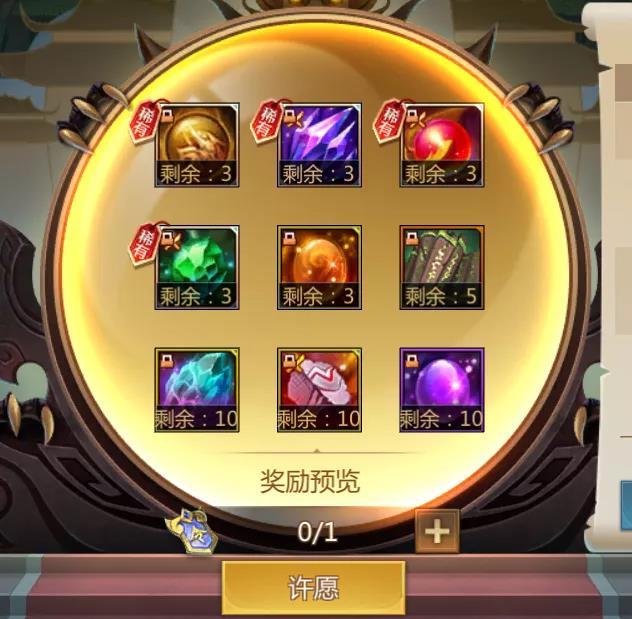 5. 每次许愿消耗一枚军令,将从许愿池中随机获得一份奖励,每类奖励由库存上限,库存为0时则不会再随机到该奖励。